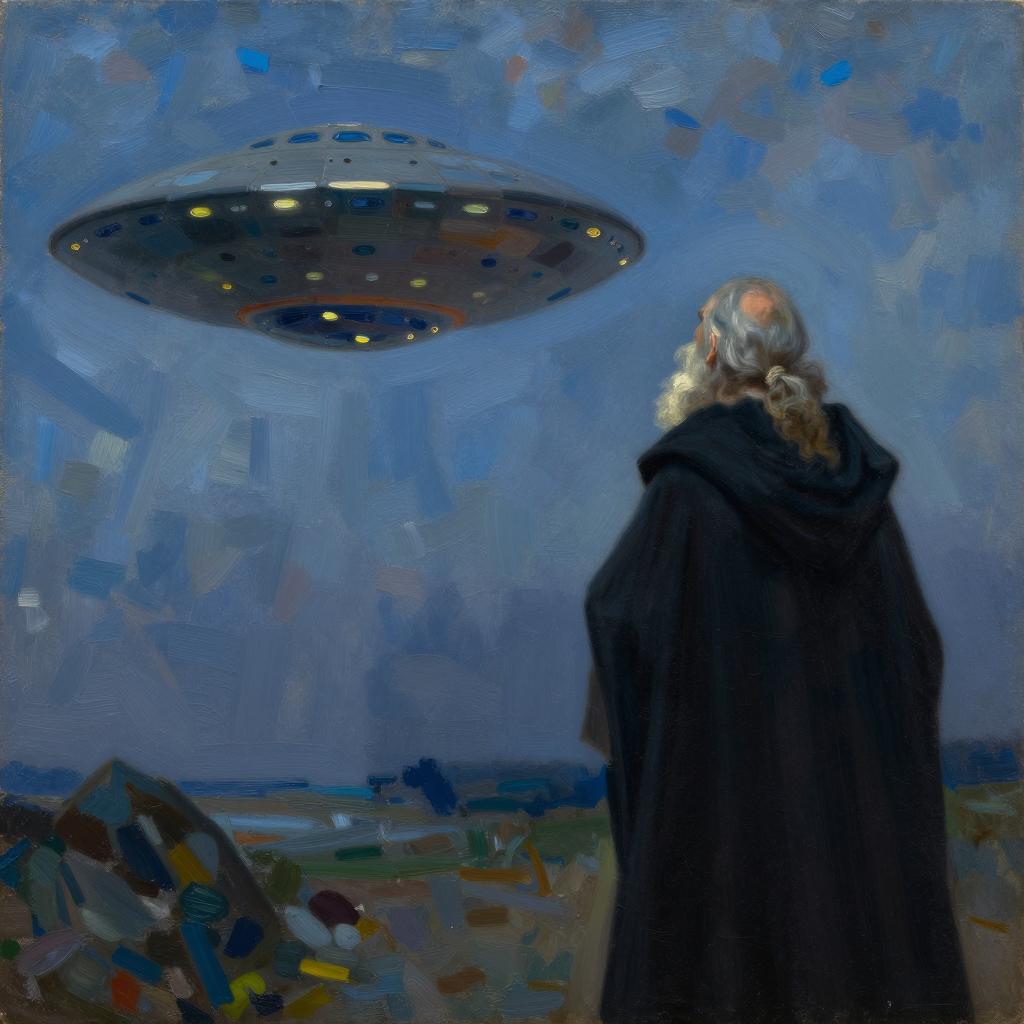 Clutter-Free professional oil painting of old druid with black cape watching an ufo, impasto, color field, color blocking, chiaroscuro, tenebrism, no frame, canvas, impressionist, glazing, sfumato, blue hour, 19th century painting,