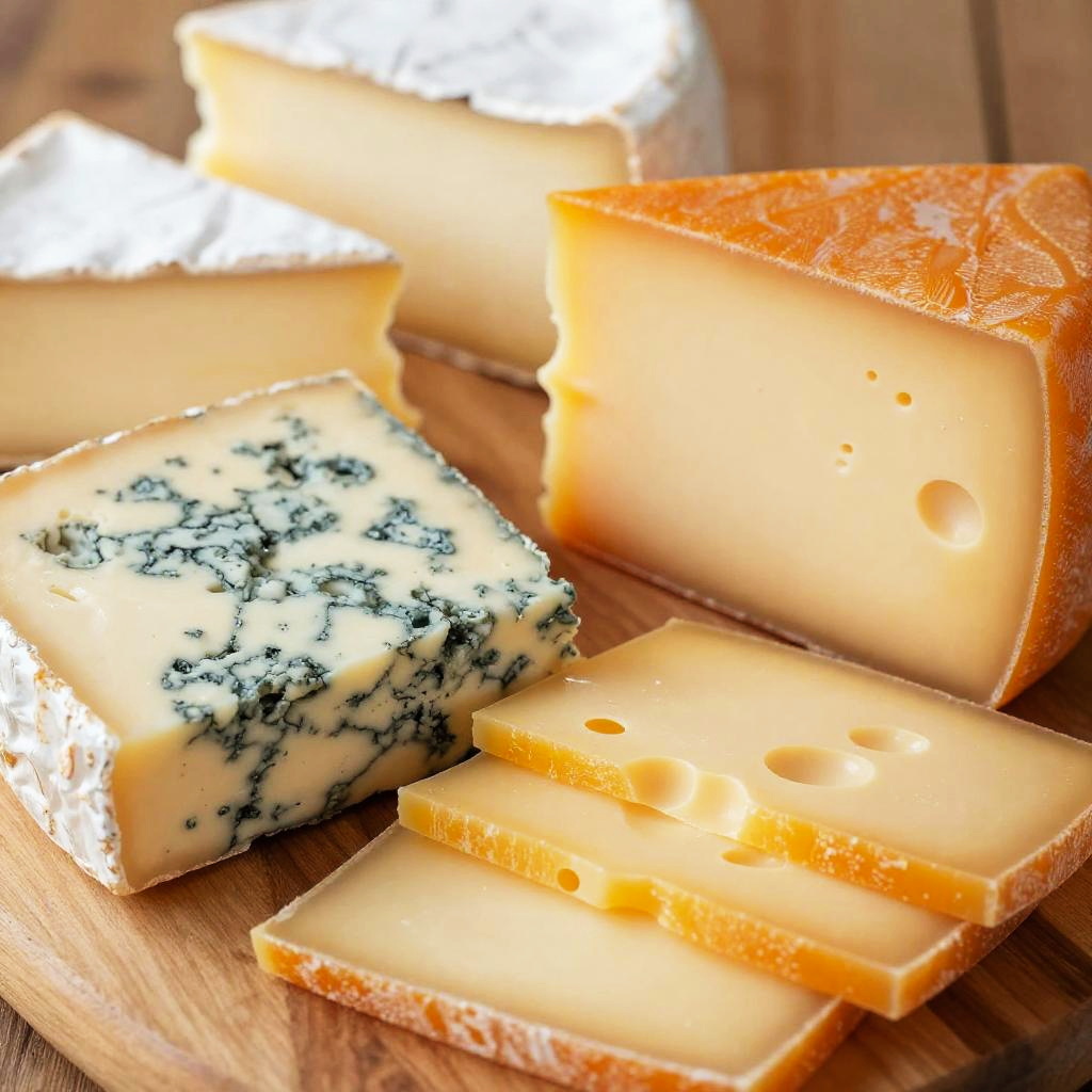 A close-up photo of assorted cheeses on a wooden surface. There's a speckled blue cheese, a yellow cheese with holes, orange semi-dried cheese slices, and a creamy white cheese. The cheeses are arranged in a slightly overlapping manner, showcasing their textures and colors. The image has a warm, natural light, highlighting the cheeses' surfaces.
