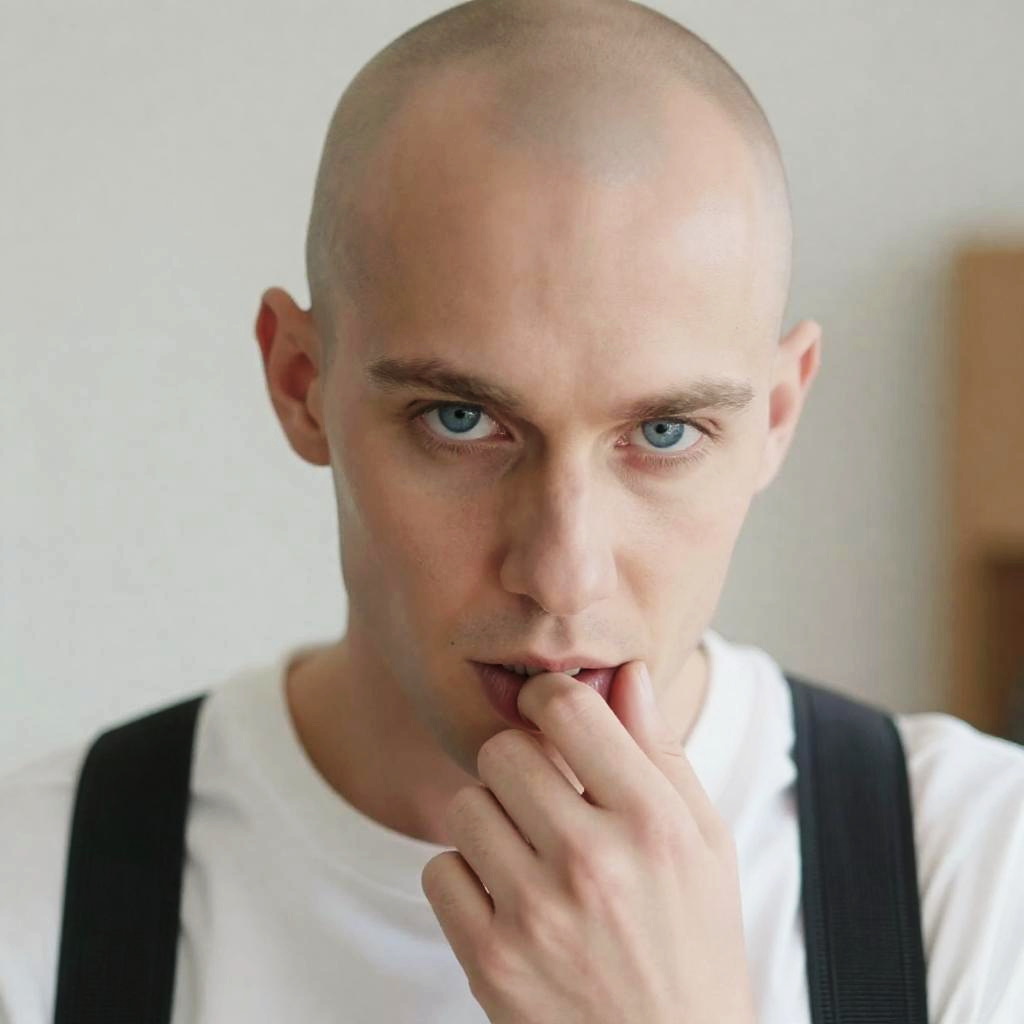 Photograph of a white man with pale skin and platinum blonde hair, looking intensely forward. He is wearing a black quilted jacket over a grey turtleneck. His hands are clasped together in front of his face. Background is blurred with soft light.