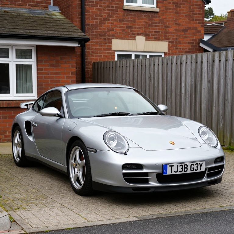 Photograph of a sleek, silver Porsche 911 parked on a paved driveway in front of a red-brick house with white-framed windows. The car has a blue license plate reading "JL39 GCV" and is positioned slightly to the left, angled towards the camera. The background includes a wooden fence and another house with a dark roof. The car's smooth, reflective surface contrasts with the textured brick and wooden fence. The driveway is made of beige and gray paving stones, and the street in the foreground is dark asphalt. The overall scene is bright and sunny.