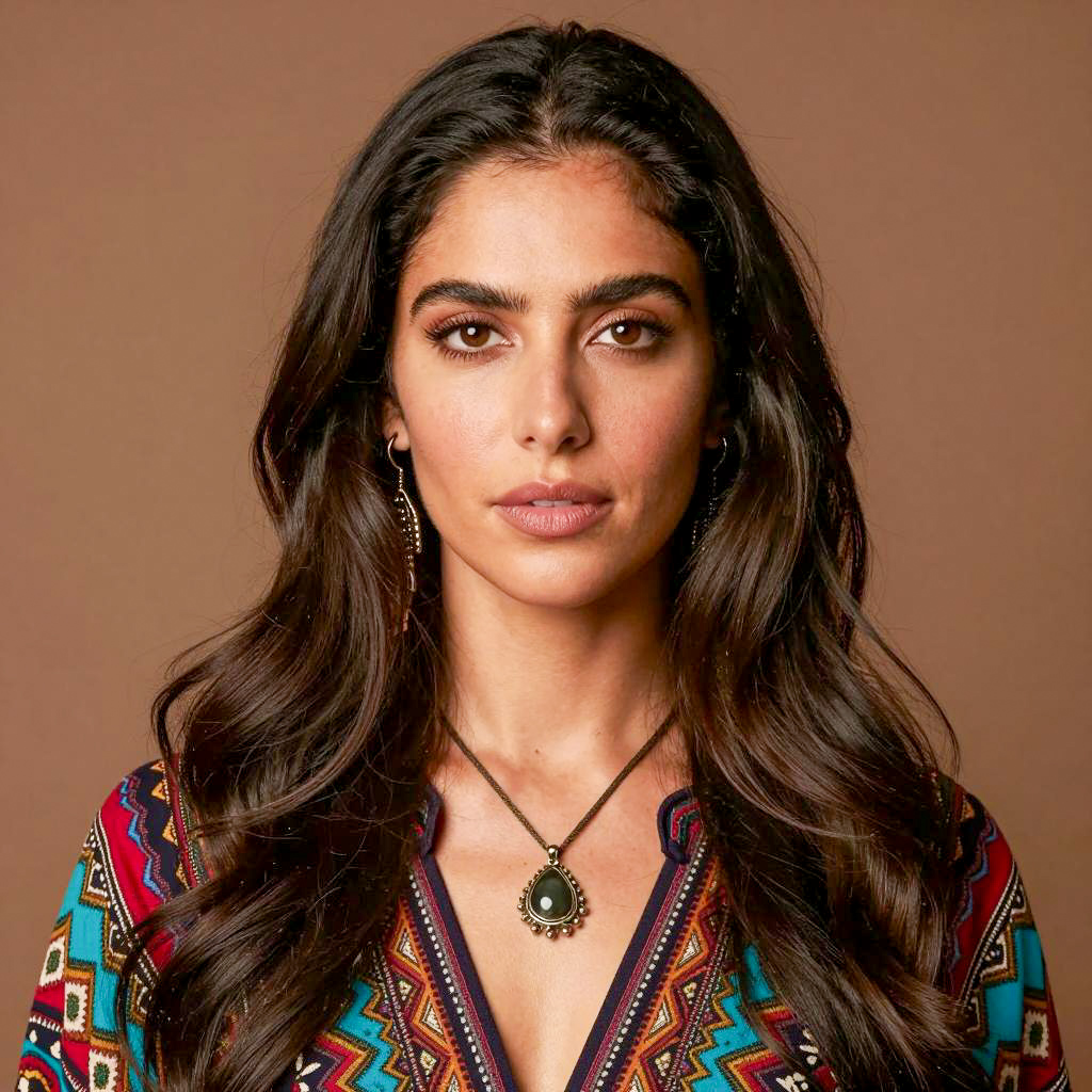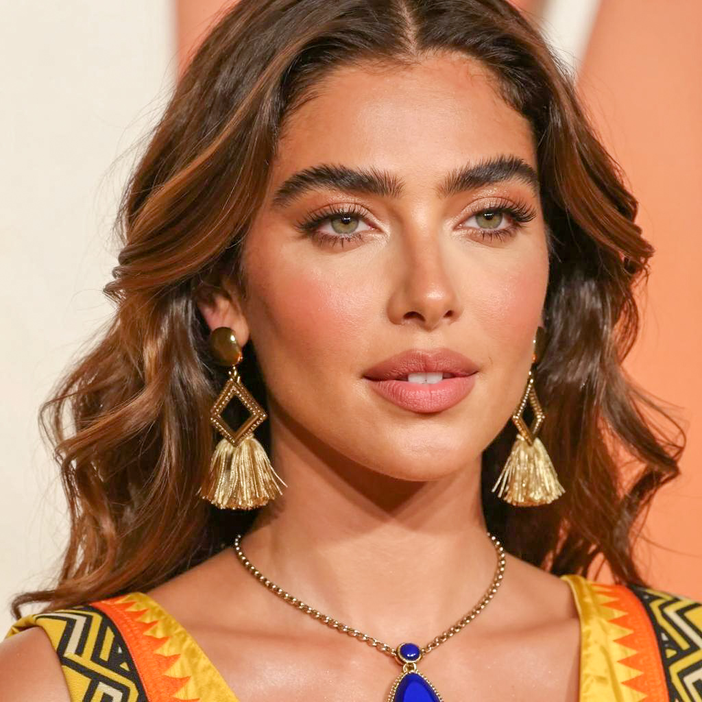 Close-up photograph of a woman with wavy brown hair, green eyes, and light brown skin. She has glitter on her cheeks, full pink lips, and wears large, geometric earrings with tassels, a chain necklace with a blue pendant, and a yellow, orange-patterned top. Her gaze is direct, lips slightly parted. Background is blurred white and orange.