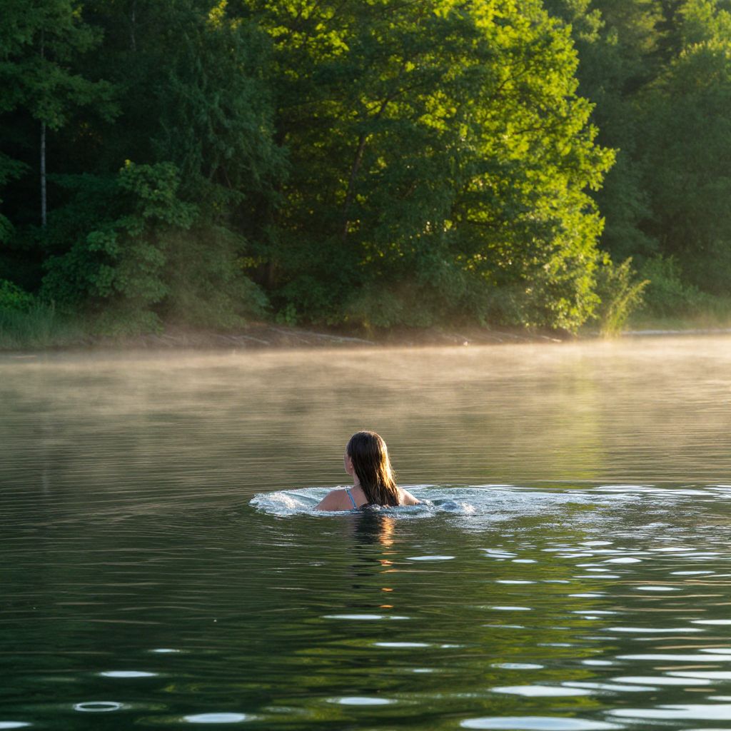 Photograph of a person with wet, dark hair swimming in a calm, misty lake, surrounded by dense, green trees with sunlight filtering through.
