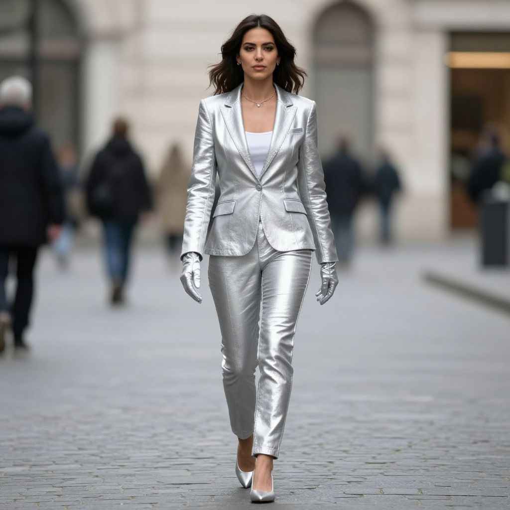 Photograph of a confident woman with medium-length dark hair and fair skin, walking down a cobblestone street. She is wearing a shiny, metallic silver blazer and matching pants, paired with white pointed-toe heels and silver gloves. Her expression is neutral, and she is slightly angled forward. The background is blurred, featuring indistinct pedestrians and historic-looking buildings with arches. The overall style is modern and chic, emphasizing her stylish, monochromatic outfit. The image has a sharp, high-contrast aesthetic.