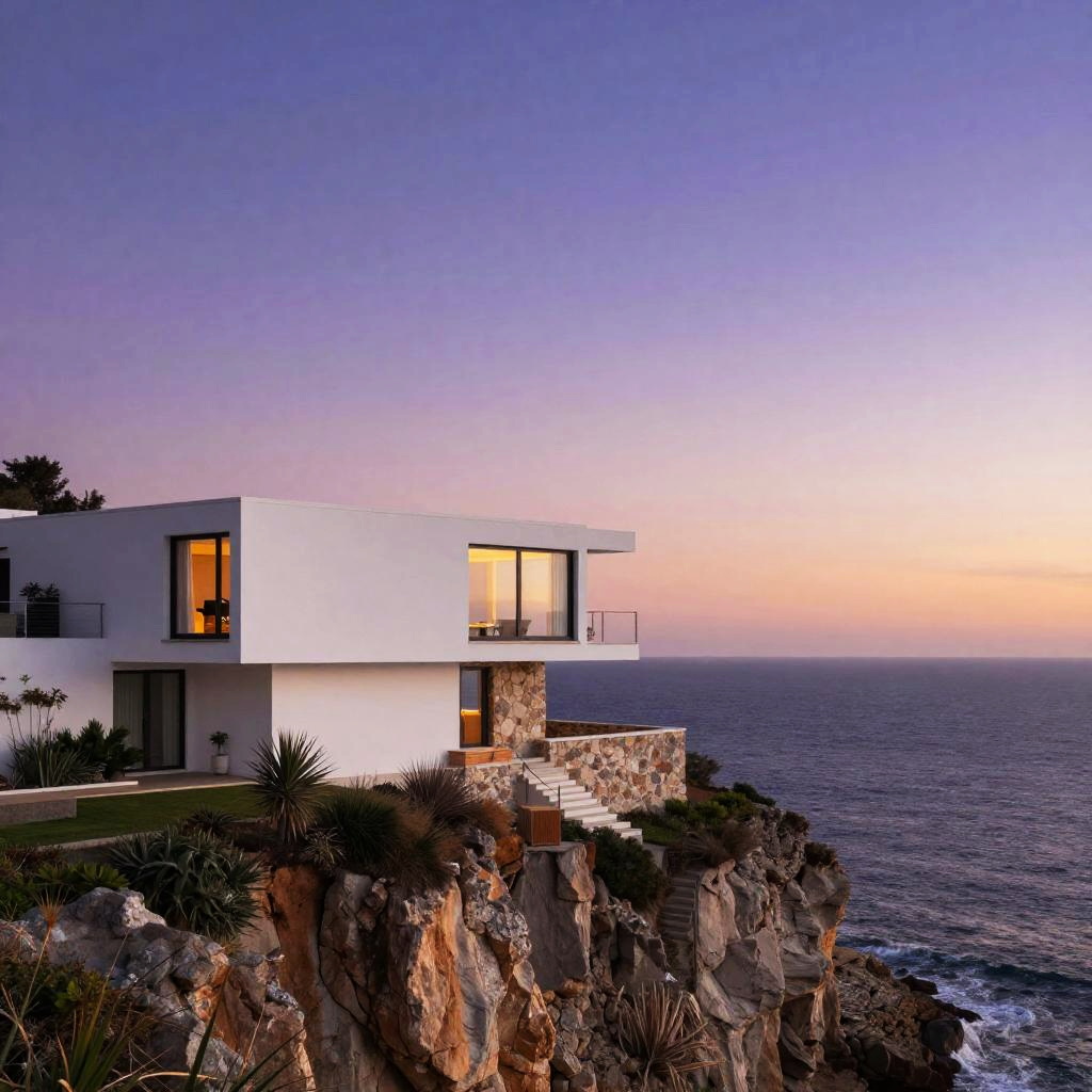 Aesthetic house on a cliff overlooking the ocean, sleek contemporary architecture, white walls contrasted with natural stone, twilight sky with vibrant purples and oranges, tranquil mood