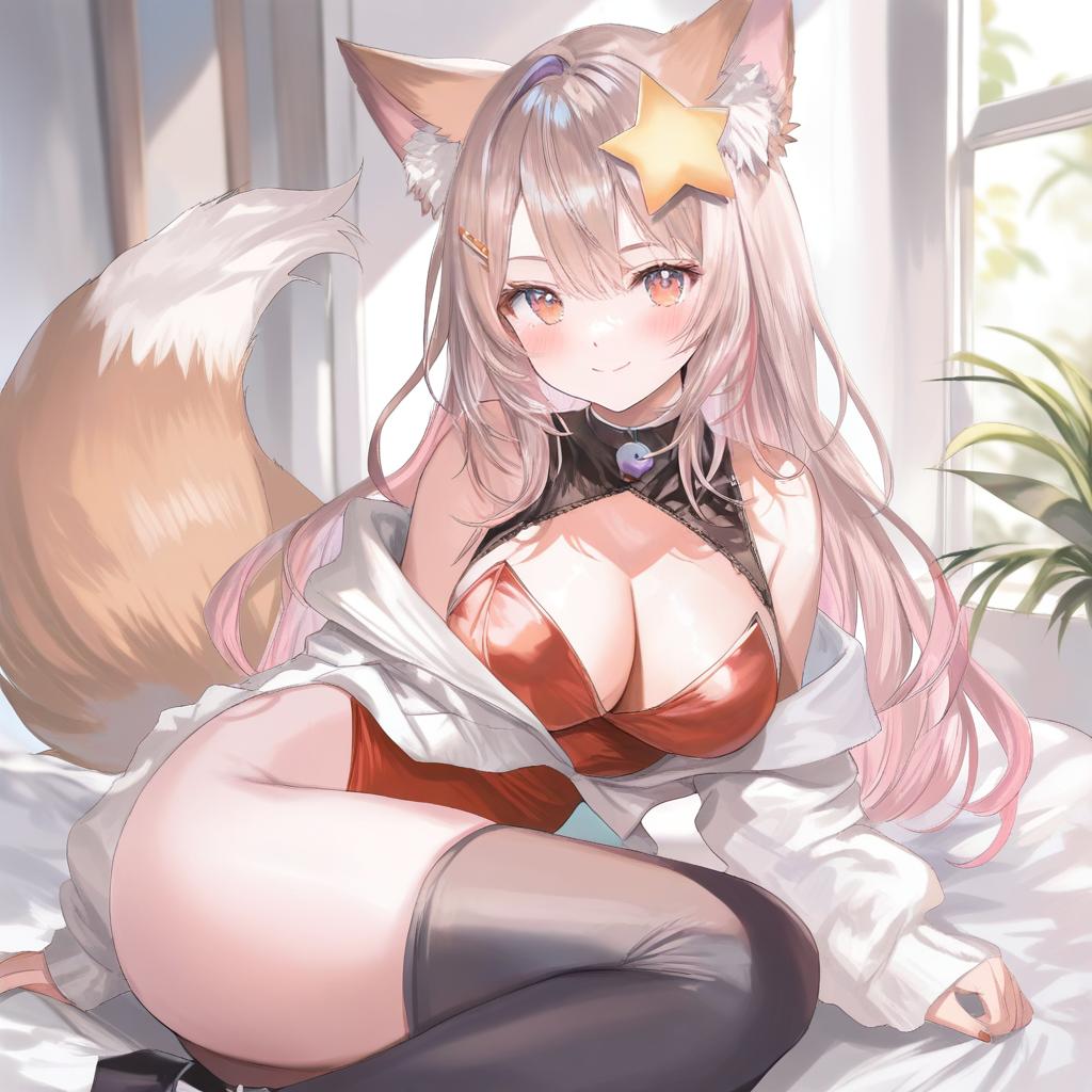 Annytf, indie virtual youtuber, 1girl, fox girl, fox ears, fox tail, animal ear fluff, brown eyes, purple eyes, long hair, brown hair, pink hair, star hair ornament, medium breasts, large breasts, cleavage, thighs, highleg leotard, red leotard, leotard under clothes, black thighhighs, long sleeves, bare shoulders, virtual youtuber, virtual youtuber, by artist momoko (momopoco), animagine