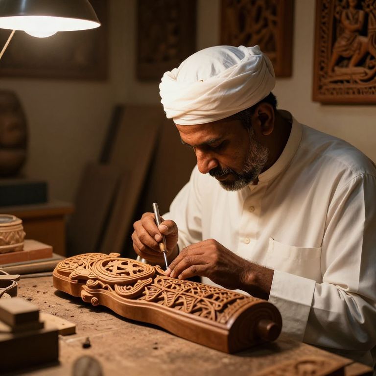 Tabish as a skilled artisan in a traditional workshop, crafting intricate wooden sculptures with fine tools, surrounded by carved artworks, warm lighting highlights textures and craftsmanship, rustic and cultural atmosphere, realistic style