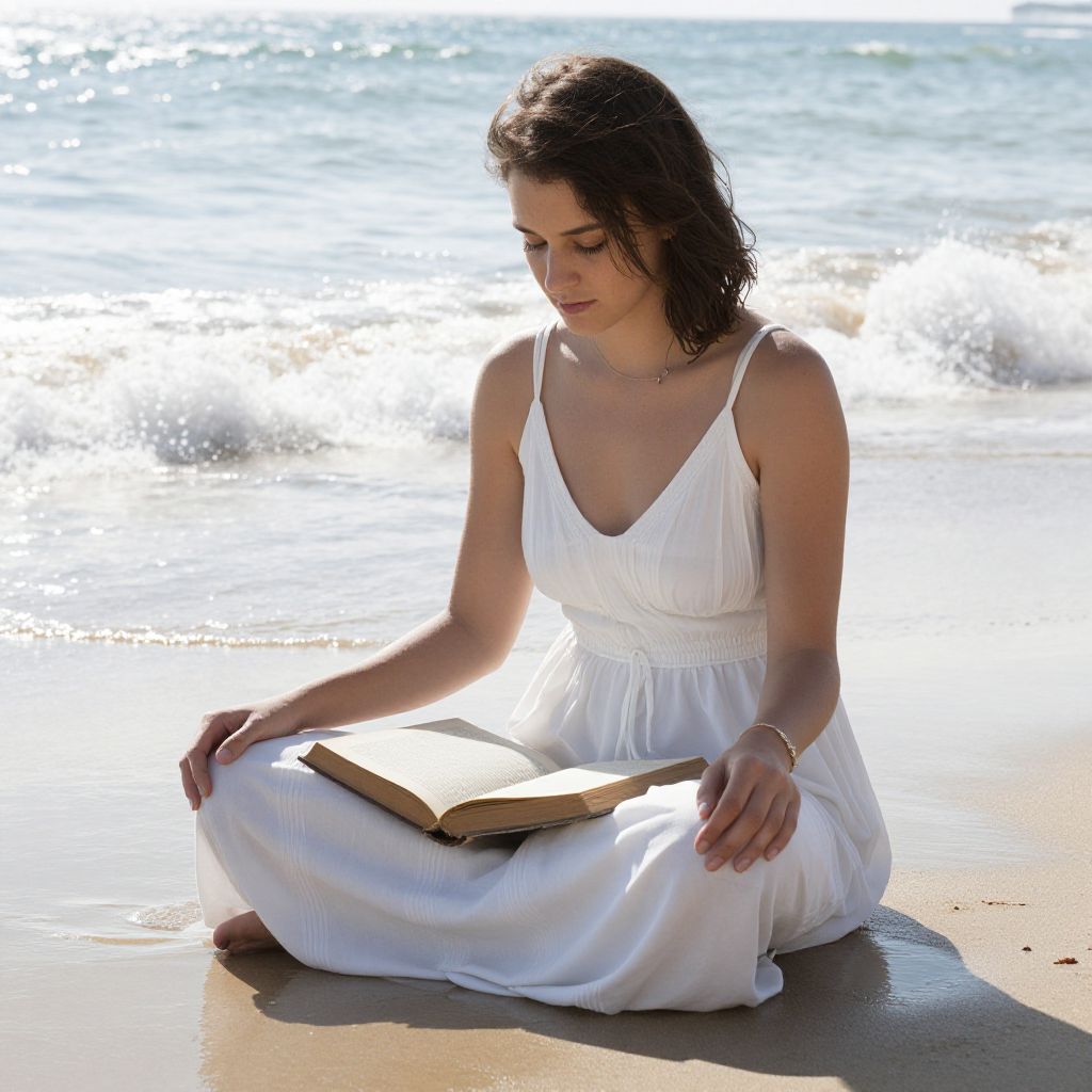 A candid, realistic shot of a woman in a flowing white dress sitting cross-legged on the damp beach, a well-worn book placed on her lap, her face serene and focused, the waves gently breaking nearby, with sunlight reflecting off the ocean and sand in a tranquil seaside environment.