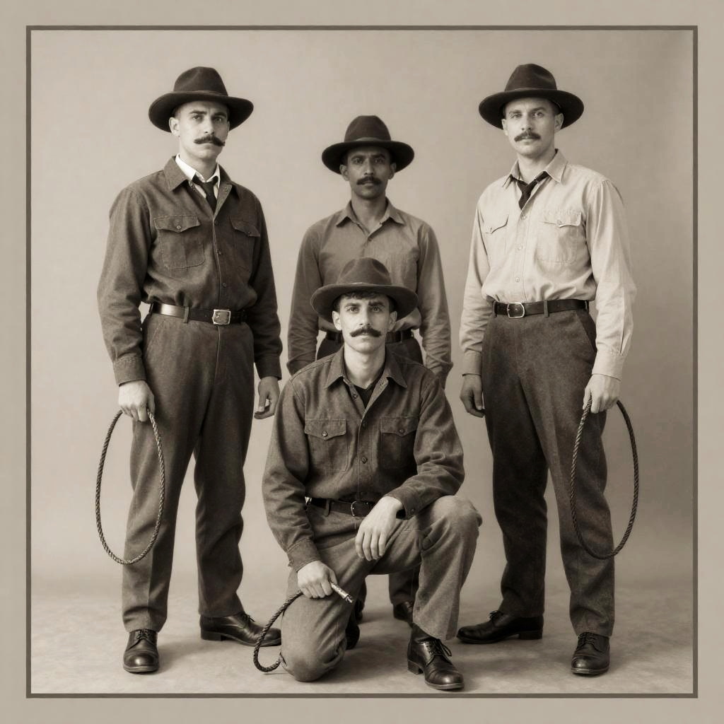 Photograph of three men in vintage clothing, all wearing hats. Left and right men stand holding whips, center man kneels holding a whip. All have mustaches, serious expressions. Light brown background, simple border. Monochromatic, sepia-toned.