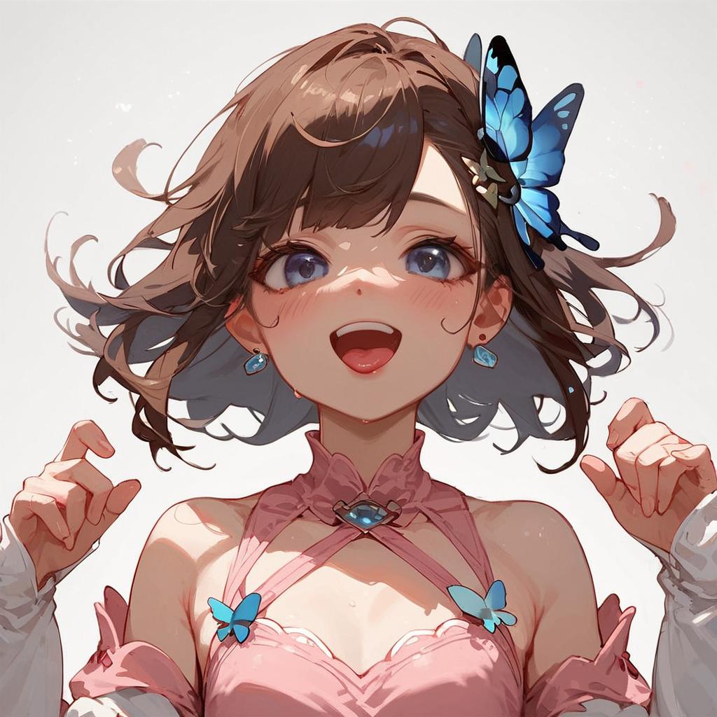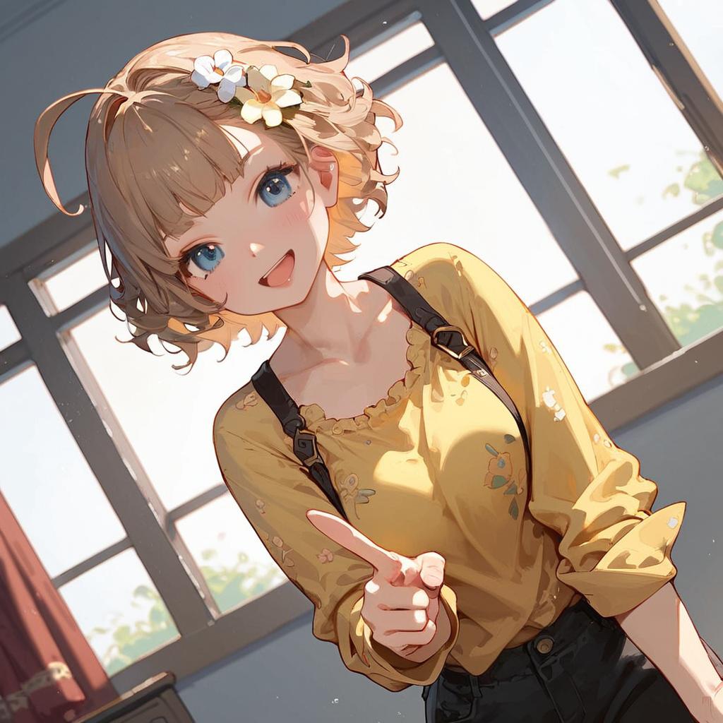 Score_9, score_8_up, score_7_up, source_anime 1girl, suou momoko, casual, dutch angle, short hair, upper body, light brown hair, brown hair, collarbone, blunt bangs, yellow shirt, wavy hair, holding, medium hair, blue eyes, blush, smile, open mouth, ahoge, hand up, blonde hair, yellow dress, pointing, eyebrows visible through hair, long sleeves, indoors, looking at viewer, head tilt, :d, solo, lens flare, window, print dress, floral print, short over long sleeves, layered sleeves, v-shaped eyebrows, black pants, pants under dress, capri pants, pants rolled up, hair flower