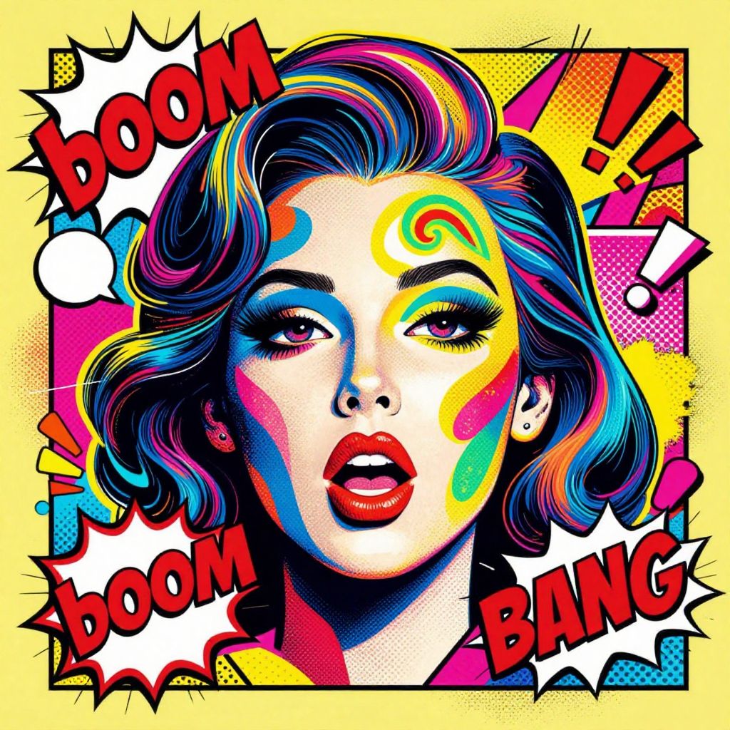 The image is a vibrant pop art illustration featuring a woman with exaggerated, expressive features. Her face is adorned with colorful, abstract shapes and patterns, including a prominent blue and yellow background with a green and red swirl. The woman's hair is styled in retro waves, adding to the vintage aesthetic. Surrounding her face are various comic book elements, such as speech bubbles and sound effects, including a \"boom\" and \"bang\" in bold, dynamic lines. The overall composition is chaotic yet harmonious, with a mix of solid colors and textured patterns that create a sense of movement and energy. The illustration is rich in detail, with a variety of shapes and colors that interplay to create a visually stimulating and dynamic scene.