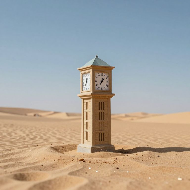 A lonely clock tower stands in a desert of shattered hours, where each grain of sand is a miniature film showing someone’s missed appointment.