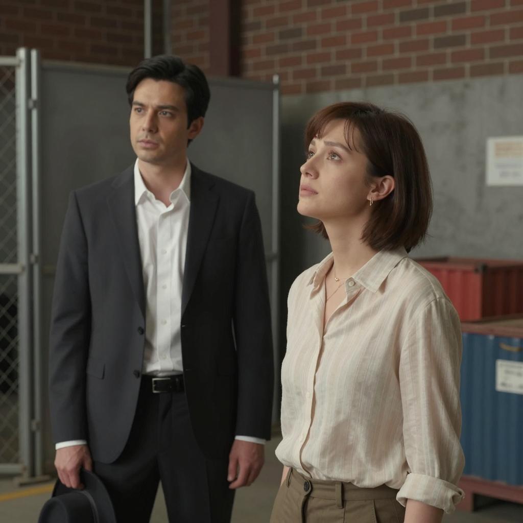 Three people in an office. Woman on left with long brown hair, sleeveless brown top, hands in pockets. Man on right with dark hair, brown jacket, gray shirt, hands in pockets, leaning on desk. Black man in background, standing against door, wearing blue suit, white shirt, striped tie. Wooden door, filing cabinet, framed picture, office chair. Man on right with intense gaze, woman with neutral expression, man in background with neutral expression.