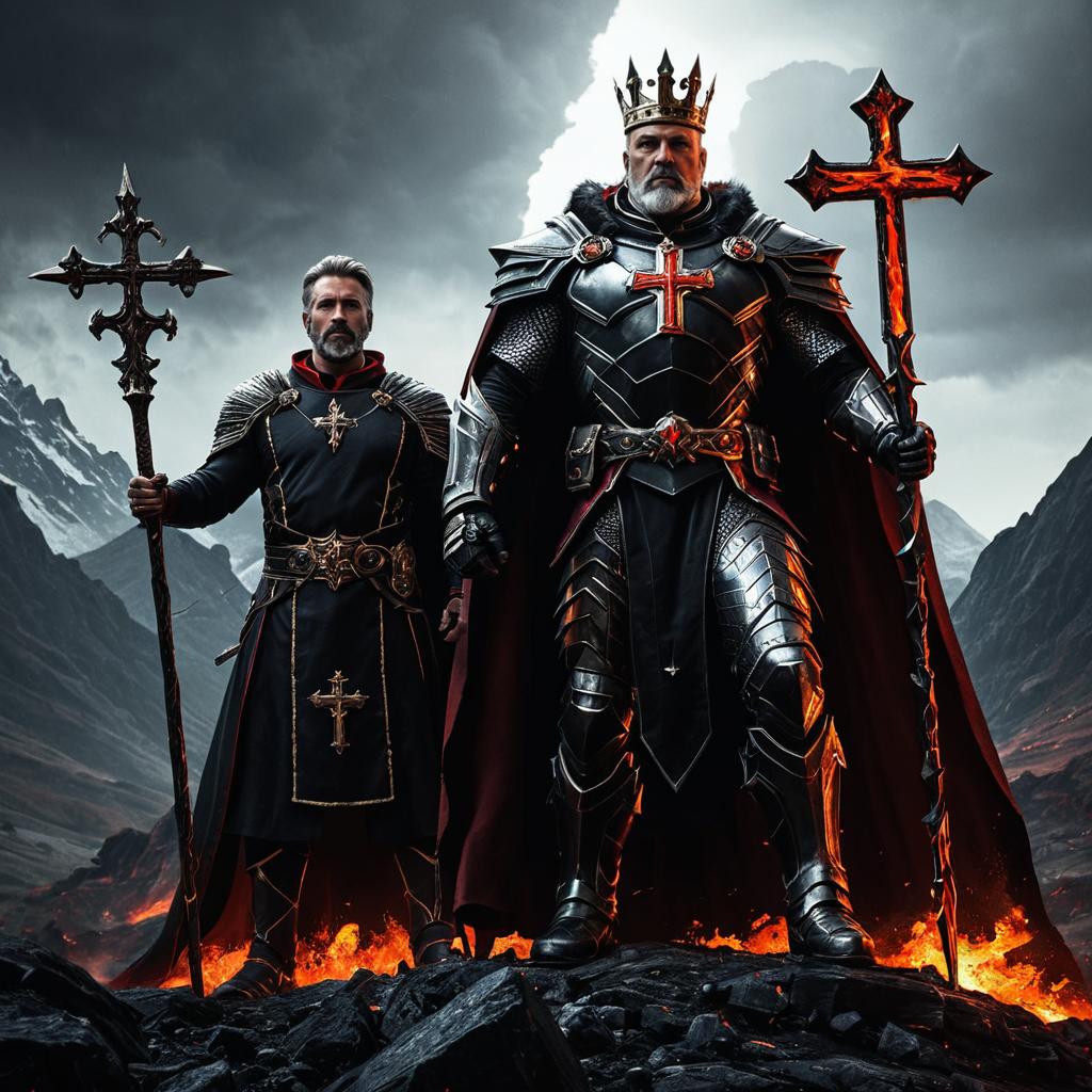 Realistic digital painting of a powerful king and his bishop standing on rocky terrain with flowing magma beneath them. Both men wear dark, intricately detailed iron armor adorned with red crosses. The king wears a crown and a fur-lined cape, holding a molten cross staff, while the bishop stands slightly behind him also holding a cross staff. The background features dramatic stormy skies and rugged mountains, creating an intense and heroic atmosphere with sharp focus and dramatic lighting.