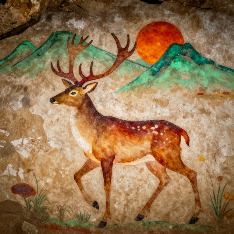 Storm A 9th Century cave mural painting of a deer with nine colors. A sun rising from green mountains in the background.,