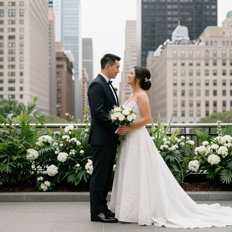 Photograph of a couple on a rooftop with an urban cityscape in the background. The groom, in a black suit with a white shirt and black tie, stands facing the bride. She wears a strapless, white lace wedding dress with a long train, holding a bouquet of white flowers. Her dark hair is styled in an updo with a small hair accessory. They gaze at each other with smiles. Surrounding them are green plants and white hydrangeas in a planter. The background features tall, multi-story buildings, with a mix of modern and classic architectural styles. The sky is overcast.
