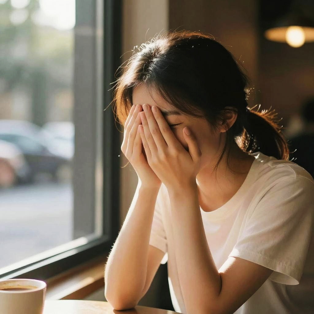 Photograph of an Asian man with medium-length, slightly messy black hair, wearing a dark gray t-shirt, sitting at a wooden table in a sunlit café. He is resting his forehead on his right hand, appearing sad or tired. In front of him is a white ceramic plate and a matching white ceramic cup. The background shows large windows letting in sunlight, blurred café furniture, and hanging lights, creating a warm, inviting atmosphere. The man's skin is light, and he has a slender build. The image conveys a sense of melancholy or fatigue in a casual, everyday setting.