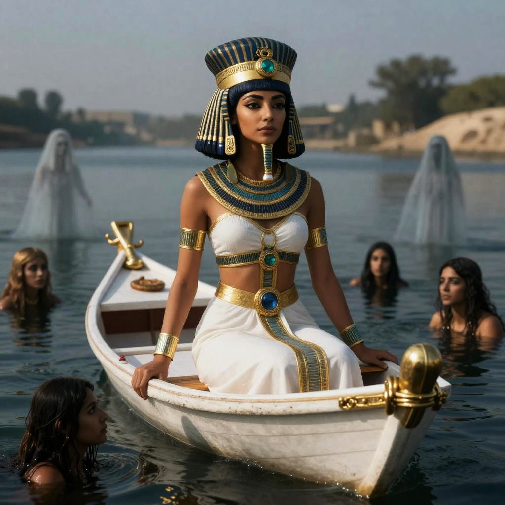 Realistic photo.beautiful young Egyptian Nefertari, queen on a boat crossing the river Styx, surrounded by lost souls in the water, ghostly apparitions, art by Artgerm, intricate and elegant, highly detailed digital painting, cinematic lighting realistic photo