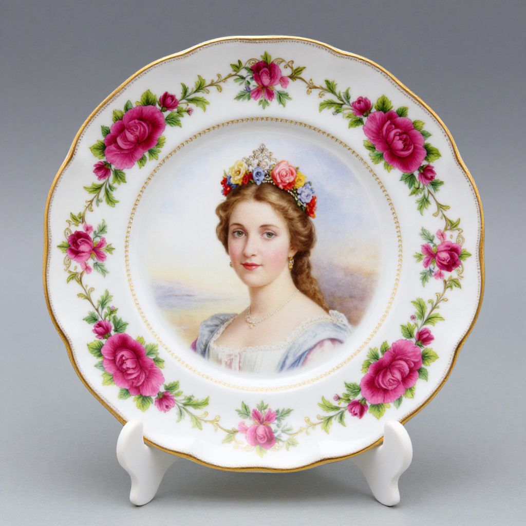 Photograph of a detailed porcelain plate featuring a painted portrait of a young woman with a floral crown, surrounded by pink roses and green leaves, displayed on
