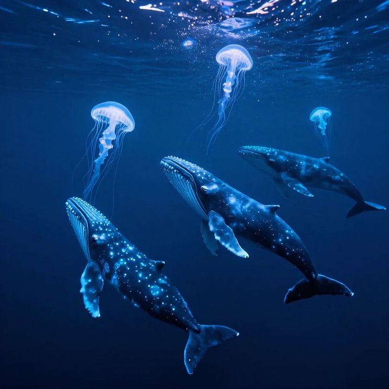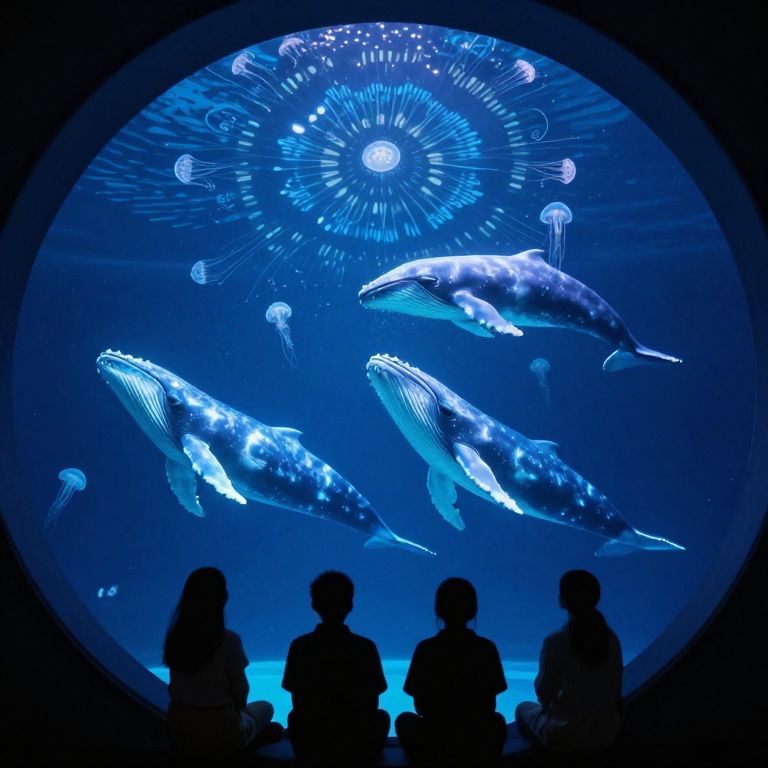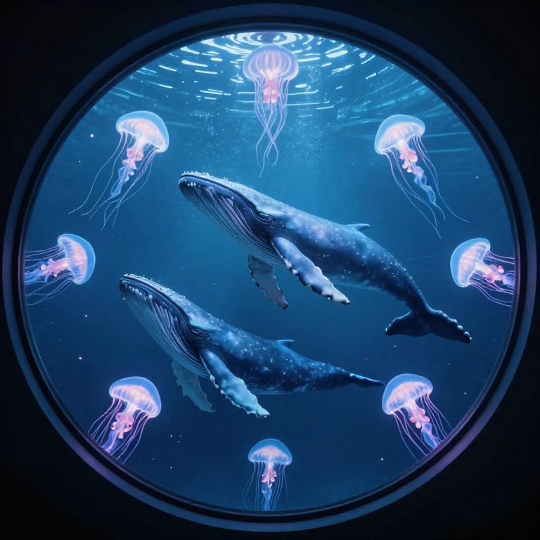 Bioluminescent whales gracefully swim in a mesmerizing underwater ballet, their ethereal glow illuminating the surrounding jellyfish that form symmetrical patterns within a large circular aquarium, as four silhouetted figures observe the spectacle from below.