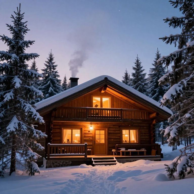 A wooden chalet surrounded by snow-covered pine trees during twilight. Warm glowing lights shine through the cabin windows and smoke rises gently from the chimney, creating a cozy and inviting holiday atmosphere in a winter forest setting.
