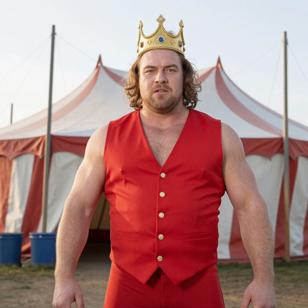 Photograph of a muscular, bearded white man with wavy brown hair wearing a gold crown and a sleeveless, red, button-up vest. He stands in front of red and white striped circus tents with blue buckets in the background. The man's intense expression and strong build are highlighted by the bright sunlight. The image has a slightly dramatic, theatrical feel, with the man's royal attire contrasting against the circus setting. The ground is dirt, and the tents' fabric appears taut.