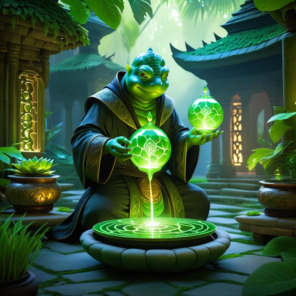 Anthropomorphic turtle monk brewing a potion in a tranquil temple garden. Styled as cinematic Magic: The Gathering artwork with volumetric lighting by Julie Dillon.