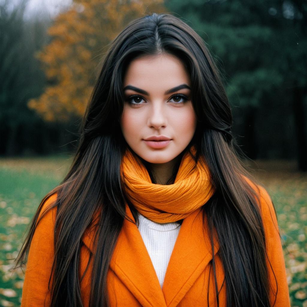 Portrait of a young woman with long dark brown hair and brown eyes standing outdoors in a park during autumn. She is wearing a bright orange coat and matching scarf over a white top. The background features blurred trees with autumn foliage and fallen leaves on the grass.