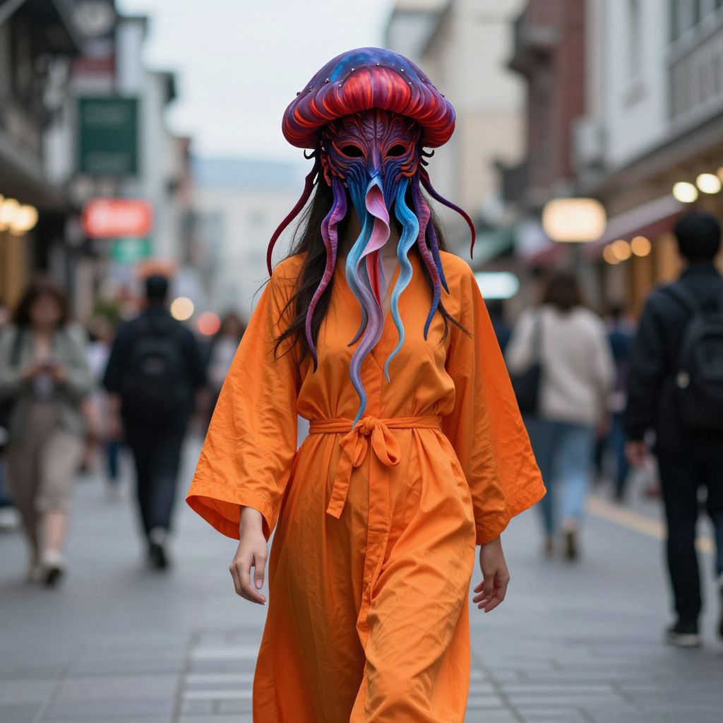 In this captivating image, a woman strides confidently down a bustling street, her vibrant orange robe contrasting beautifully with the urban backdrop. Her head is adorned with an intricate, jellyfish-like mask, a mesmerizing blend of deep reds, purples, and blues that seem to pulsate with an otherworldly energy. The mask's tentacles, a mix of soft, flowing lines and sharp, angular shapes, trail behind her, adding a sense of movement and dynamism to the scene. The background, a blur of city lights and buildings, serves to highlight the woman's striking figure, making her the undeniable focal point of the composition. The interplay of colors, textures, and shapes creates a visually rich tapestry that draws the viewer's eye from the mask's intricate details to the woman's confident stride, and finally to the vibrant street that stretches out before her.