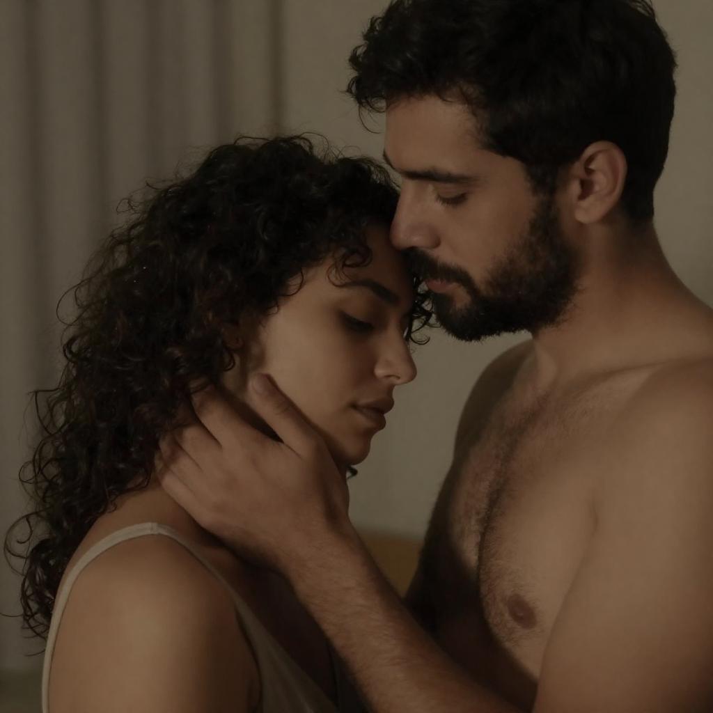Photograph of a couple in an intimate embrace. Man with dark hair, wearing a dark shirt, smiling, eyes closed. Woman with curly blonde hair, bare shoulders, smiling, eyes closed. Blue light in background. Forearms intertwined, heads touching.