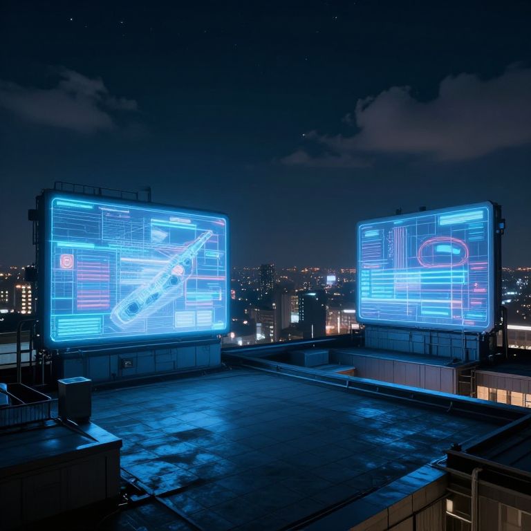 Nighttime rooftop with two neon blue digital screens displaying abstract blue patterns, set against a cityscape with scattered lights.