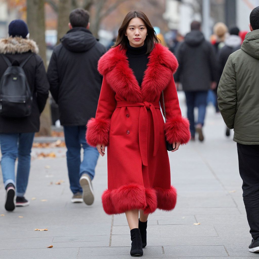 Woman wearing a vibrant red coat with plush fur trim and cuffs, accessorized with a black turtleneck and carrying a small black bag, stands confidently on a bustling city sidewalk surrounded by pedestrians and autumn leaves.