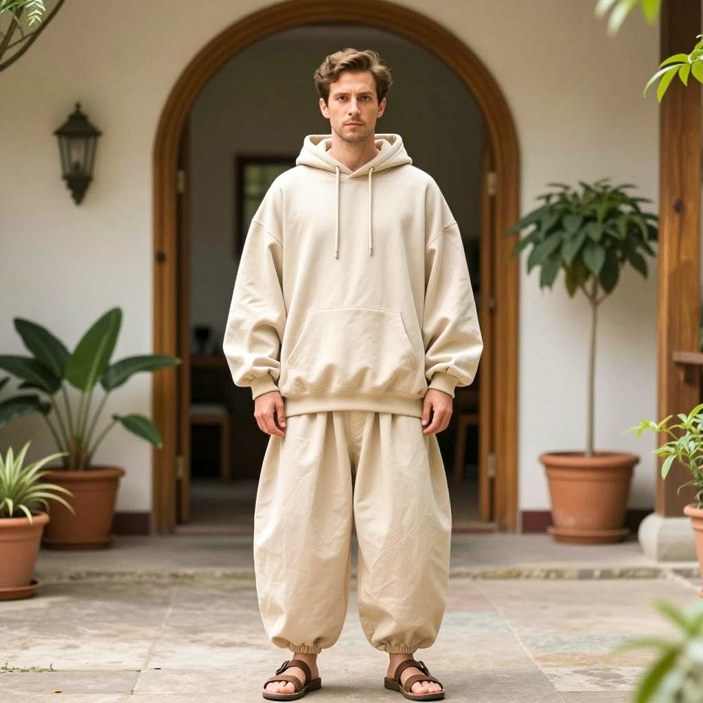 Adam baggy costume, photograph of a man, standing, center frame, wearing beige oversized hoodie, loose beige pants, brown sandals, short brown hair, serious expression, barefoot, indoor courtyard, wooden archway background, potted plants, daytime, soft natural light, realistic style