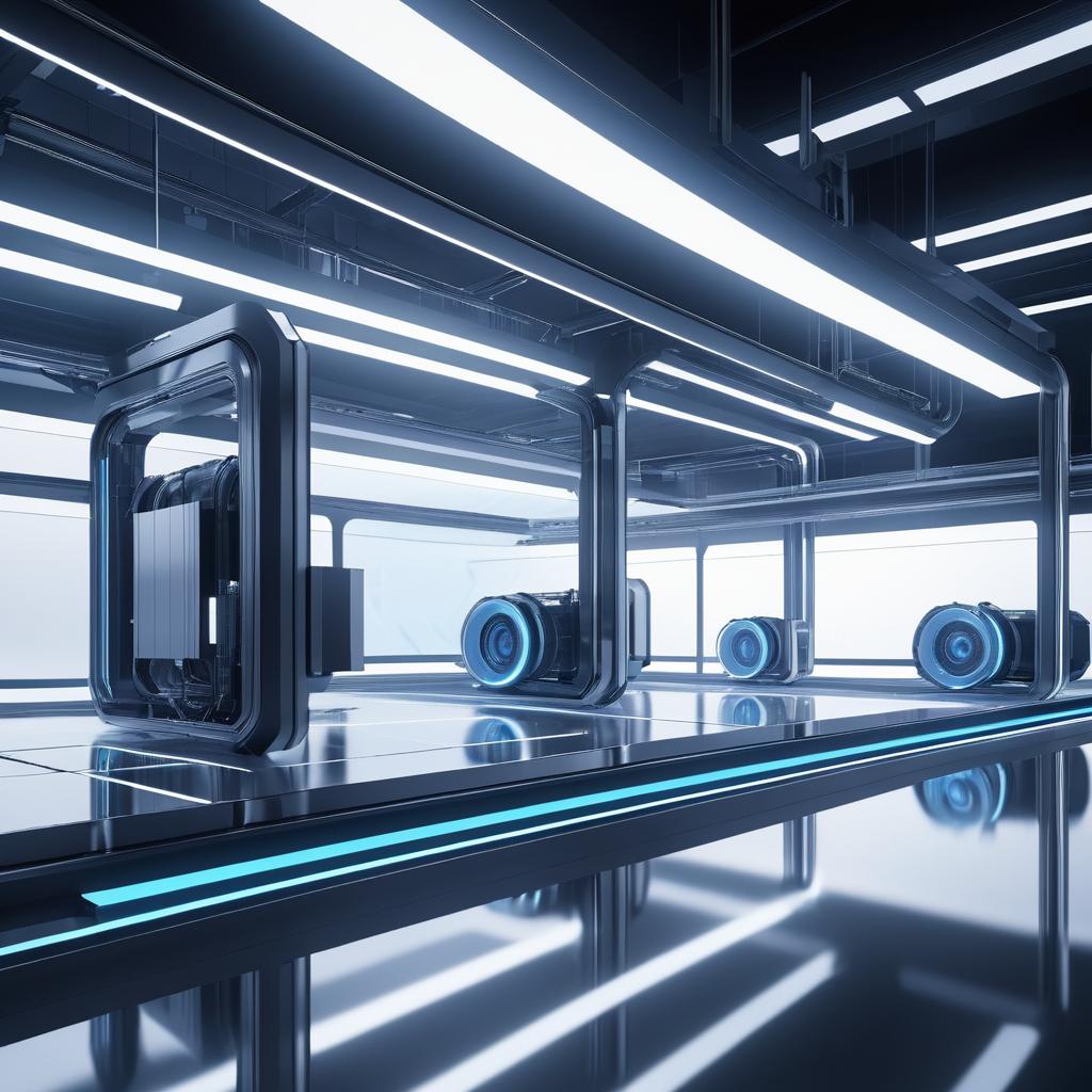 Emphasis want an independent minimalist microscopic model full of futuristic technology, like an open room, with robots, conveyor belts, cleaning pipes, and intelligent water spray devices in the space. The overall light and shadow are bright, and the elements are made of metal. The viewing angle is horizontal,8k ultra,