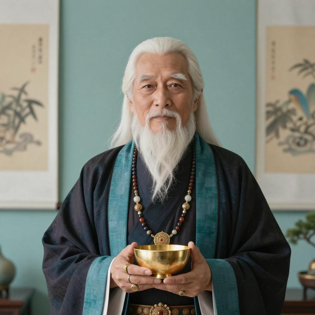 Old man with bald head, light skin, wearing beige shirt and brown strap, sitting in futuristic chair, serious expression. Background includes glowing green light, metallic surfaces, and control panel. Film still.