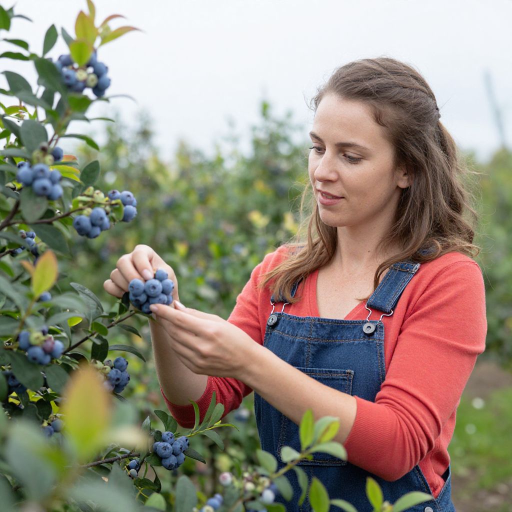 Young woman with fair skin and brown hair, wearing a white shirt and denim overalls, gently picks ripe blueberries from a lush, green bush in