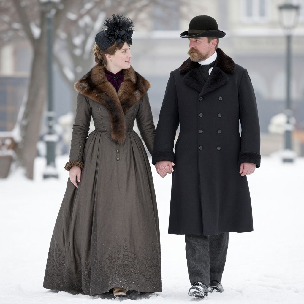 Photograph of a Victorian-era couple walking hand-in-hand in a snowy urban setting. The woman, with fair skin and brown hair, wears a dark brown, long-sleeved, fur-trimmed dress and a black feathered hat. The man, with a beard and fair skin, dons a black double-breasted coat with a fur collar, black bow tie, white shirt, and black bowler hat. Both wear black gloves. The background is blurred, featuring leafless trees and street lamps. The snowy ground and overcast sky add a cold, wintery atmosphere. The couple gazes at each other, exuding a sense of elegance and timeless romance.