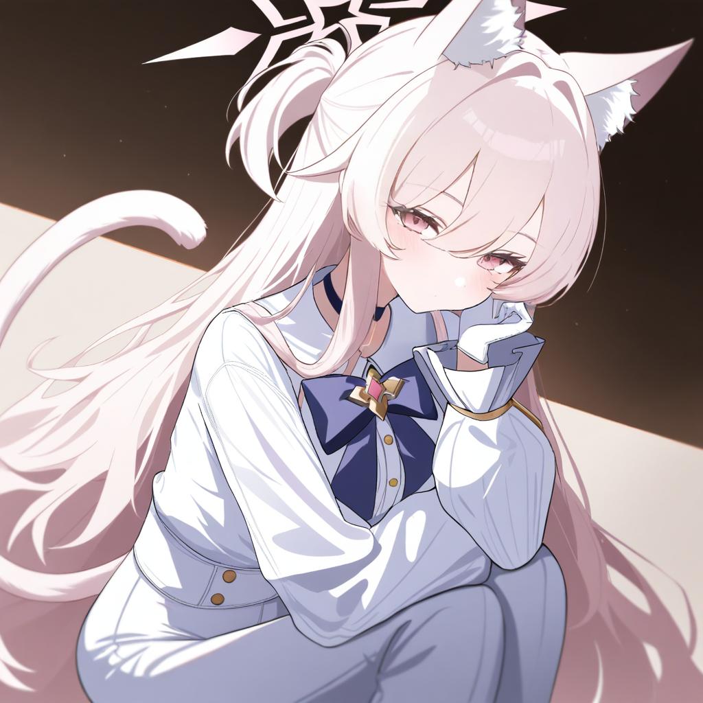 Akira (blue archive), blue archive, 1girl, cat girl, cat ears, animal ear fluff, cat tail, red eyes, hair between eyes, colored eyelashes, long hair, white hair, pink hair, white shirt, white gloves, white pants, halo, pink halo, long sleeves, black choker, by artist y2, animagine