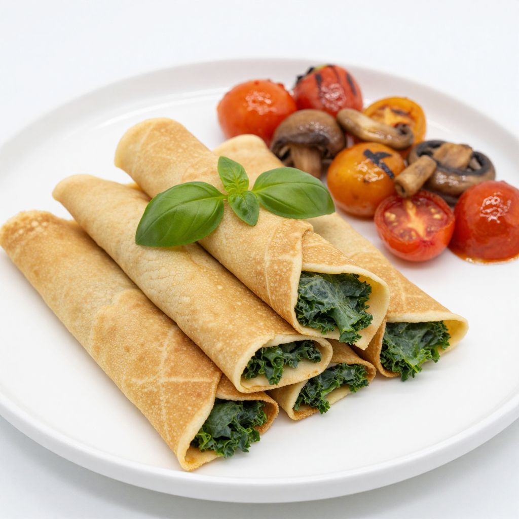 Golden crepes elegantly rolled and stacked on a pristine white plate, filled with vibrant green kale and garnished with fresh basil, accompanied by a colorful assortment of pan-roasted cherry tomatoes and mushrooms in the background.