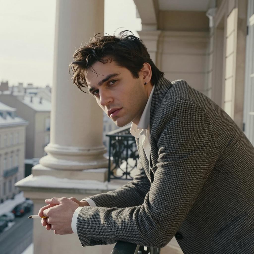 Photograph of a young man with dark, slicked-back hair, fair skin, and a slight smile, holding a cigarette in his mouth. He wears a black suit jacket over a pink collared shirt. Neon sign in the background reads "BEER" in red letters. Soft lighting, subtle shadows. Background is a plain wall.