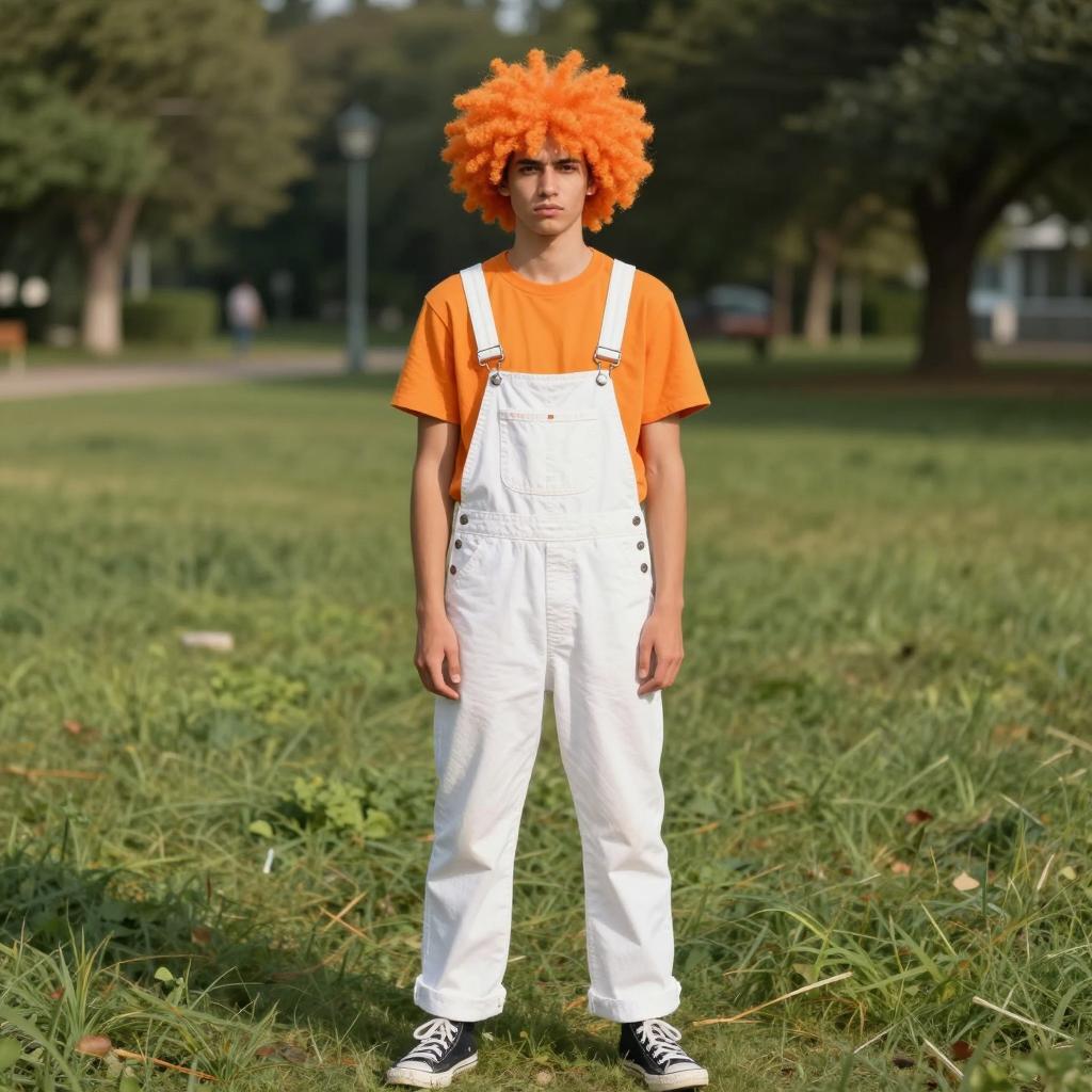 Photo of a young man standing in a green park during daytime wearing a bright orange wig, orange t-shirt, white overalls, and black sneakers. The background is blurred, featuring trees and grass under sunlight, with the subject showing a serious expression.