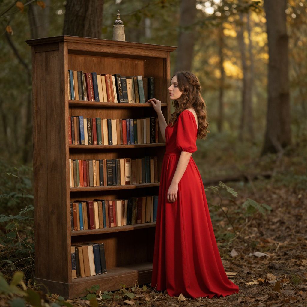In a serene forest bathed in golden-hour light, a woman in a flowing red dress stands beside a rustic wooden bookshelf brimming with colorful spines, as if tending to a living library where whispers of ancient tales linger in the still air.