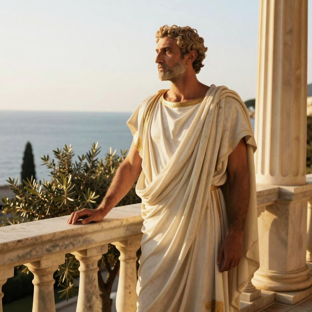 Filosofia depicted as a serene, ancient Greek agora filled with thoughtful philosophers in flowing robes debating under olive trees, soft golden sunlight illuminating marble pillars, evoking wisdom and timeless inquiry, detailed classical architecture and gentle nature.