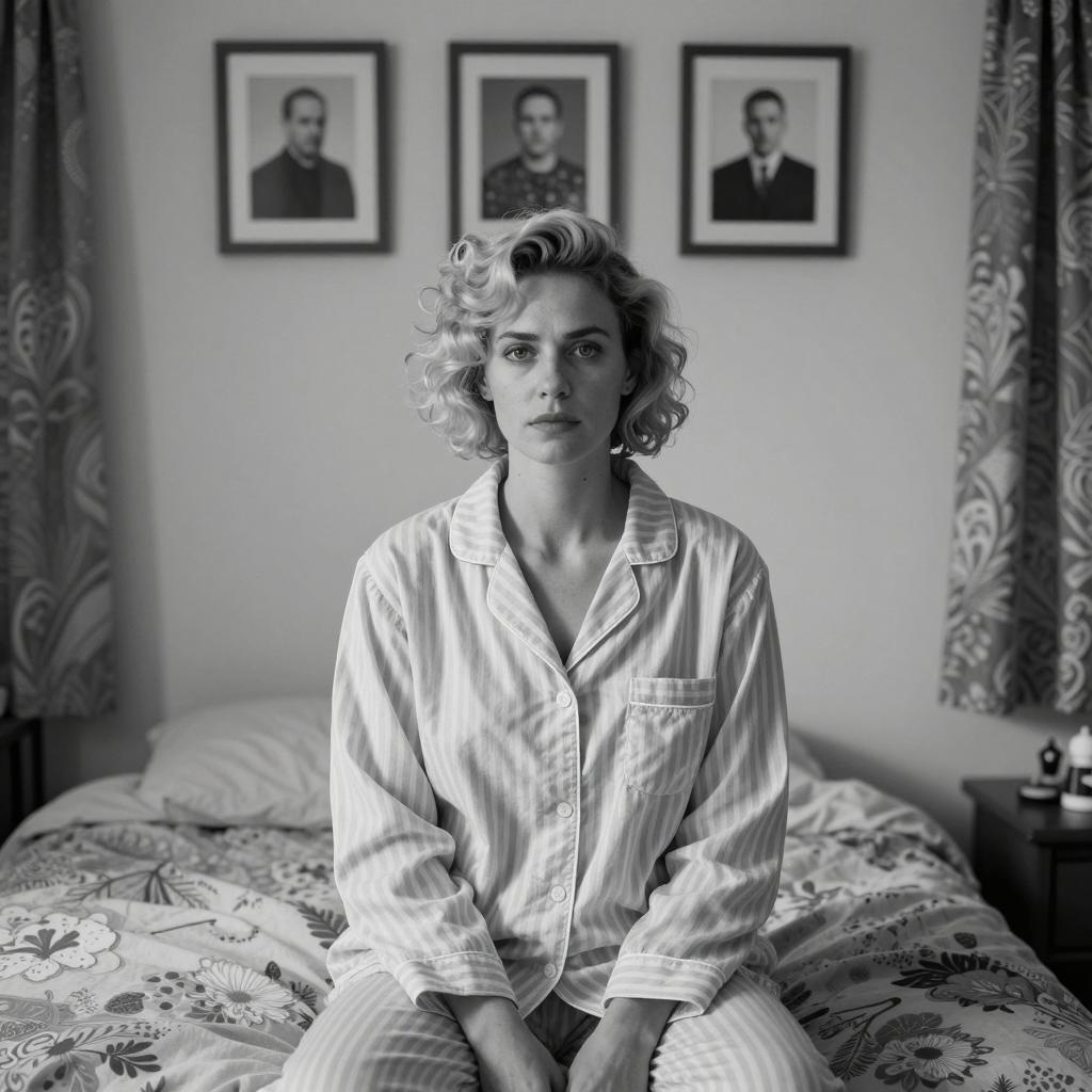 Black and white photograph of a woman with short, curly blonde hair, wearing a striped pajama set, sitting on a bed. She has a serious expression. Three framed pictures on the wall behind her. Patterned curtains on either side. Bed with a floral-patterned blanket on the left.