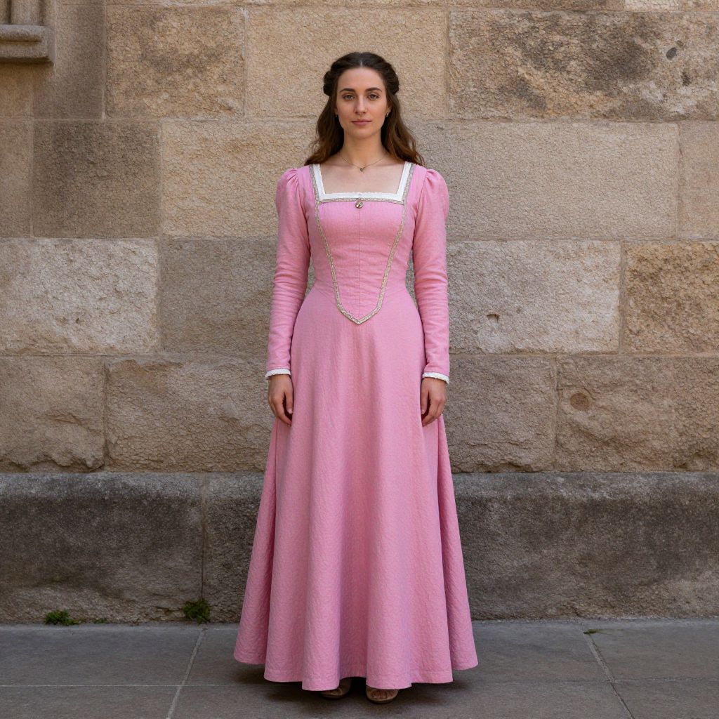 Photograph of a woman with long brown hair, wearing a pink medieval-style long dress with white trim, standing against a stone wall.