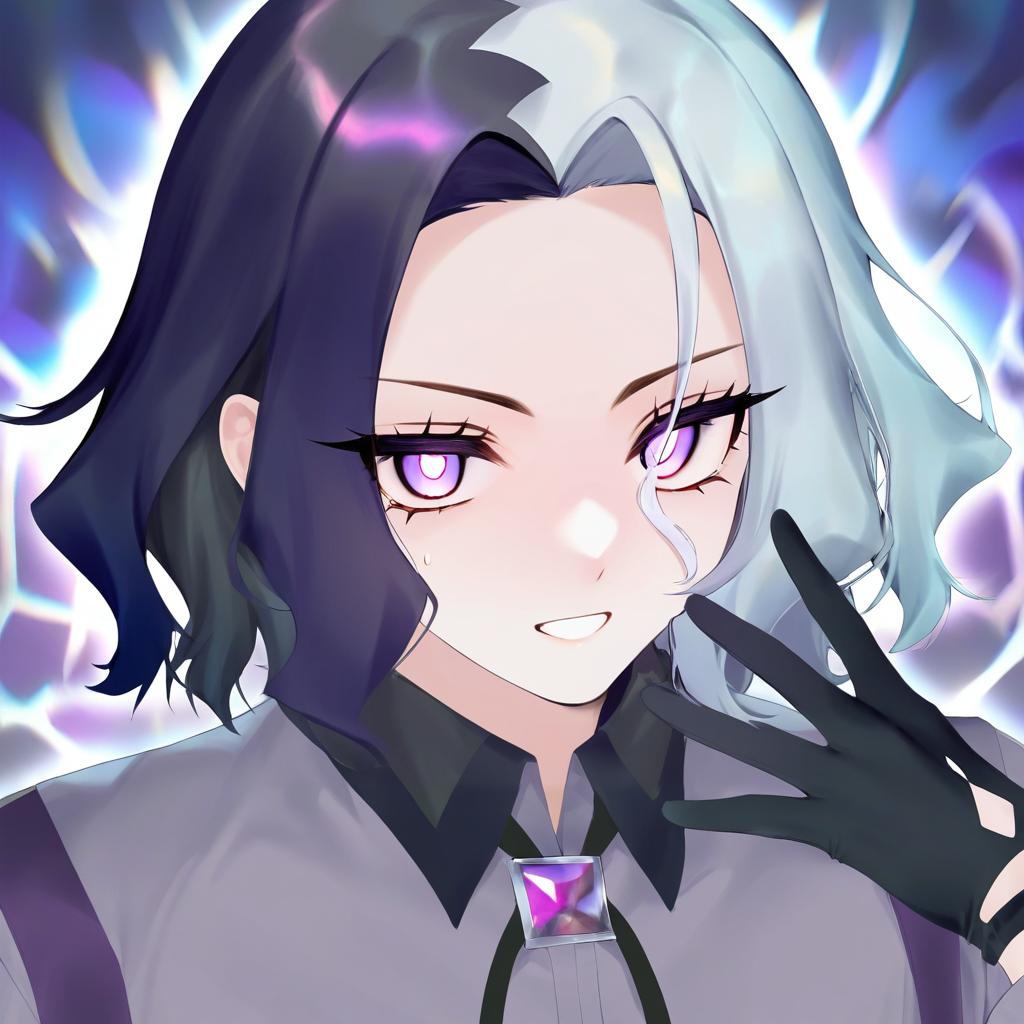 Digital anime-style illustration of a young male character with two-tone short hair in black and grey, styled with a loose hair strand. The character has distinctive purple eyes with white symbol-shaped pupils and long eyelashes. Dressed in a grey collared shirt with black accents, a neck ribbon adorned with a purple gemstone, and wearing black gloves. The background features a glowing abstract light effect, adding a mystical ambiance.
