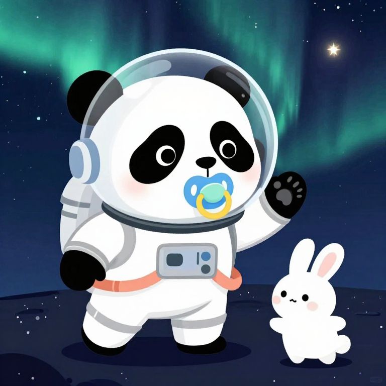 Pantone Panda baby with pacifier in a spacesuit in space playing with a baby rabbit. With Northern Lights in the sky. Pixar-Style,