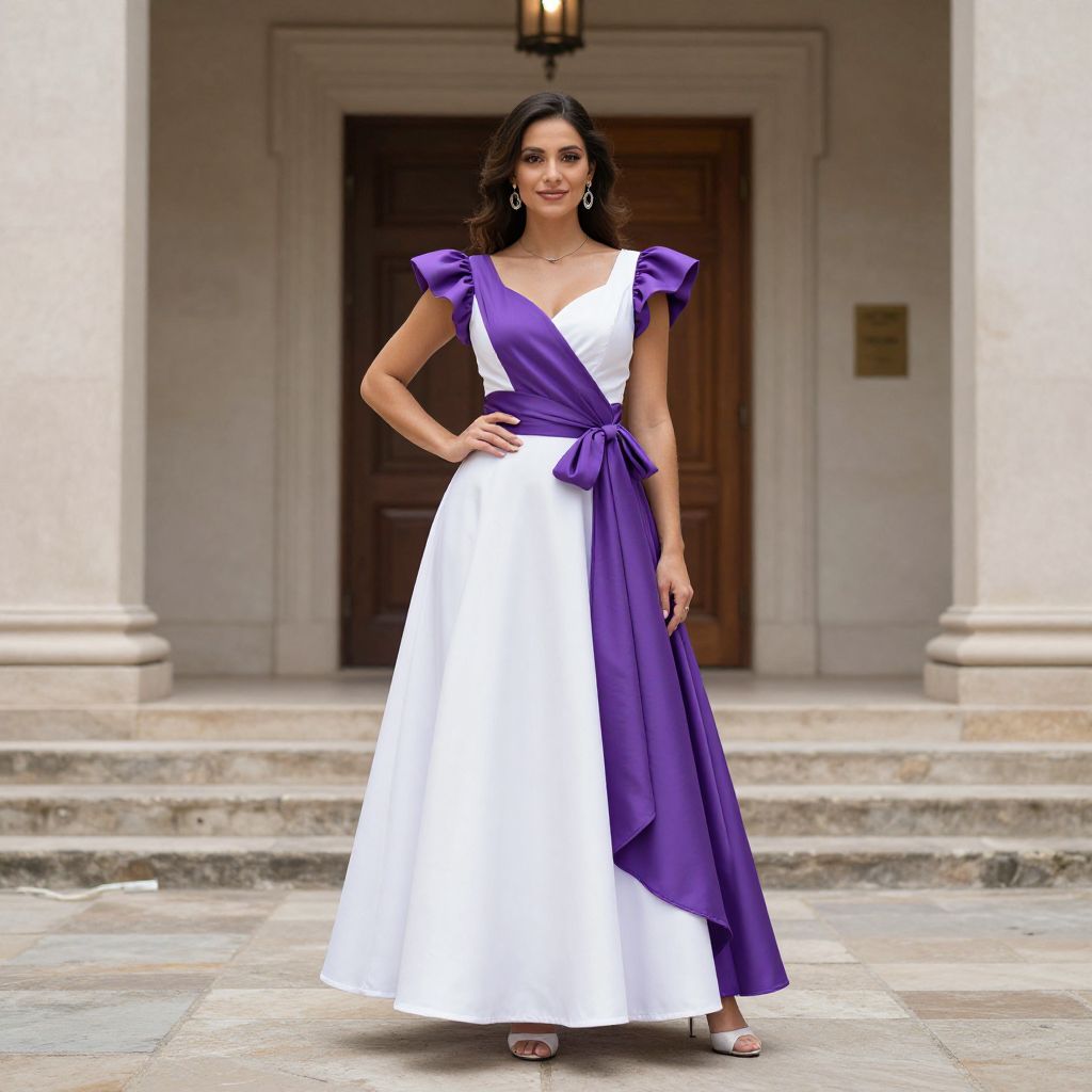 Photograph of a smiling woman with medium-dark skin, long wavy black hair, and dark eyes standing in front of a stone building with a wooden door. She is wearing a white, floor-length, V-neck gown with short purple sleeves and a large purple sash tied around her waist. She accessorizes with small drop earrings and black high-heeled sandals. The background features stone steps and a slightly blurred doorway with a small plaque on the right. The lighting is natural, highlighting the vivid purple and white colors of her dress.