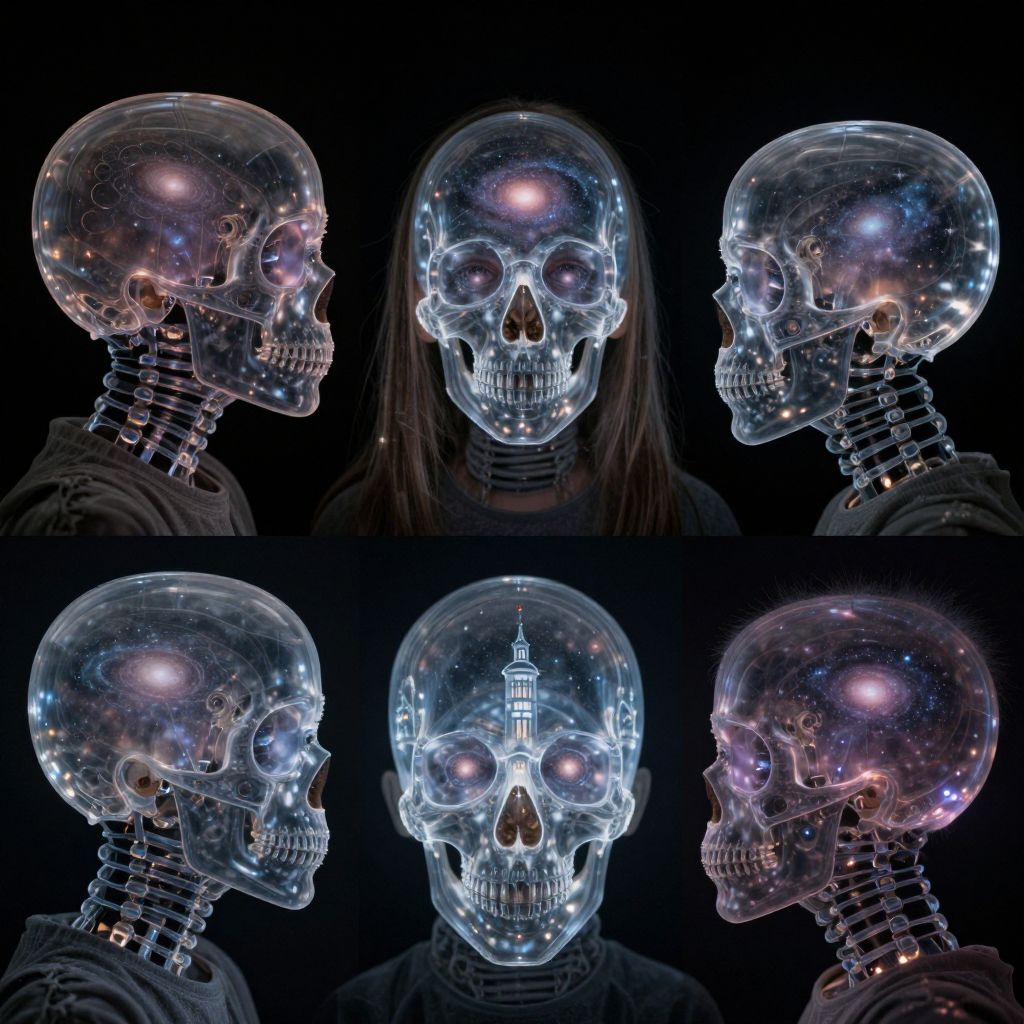 Children with transparent skulls reveal tiny galaxies dancing inside their minds, as they build cities from nightmares and light.