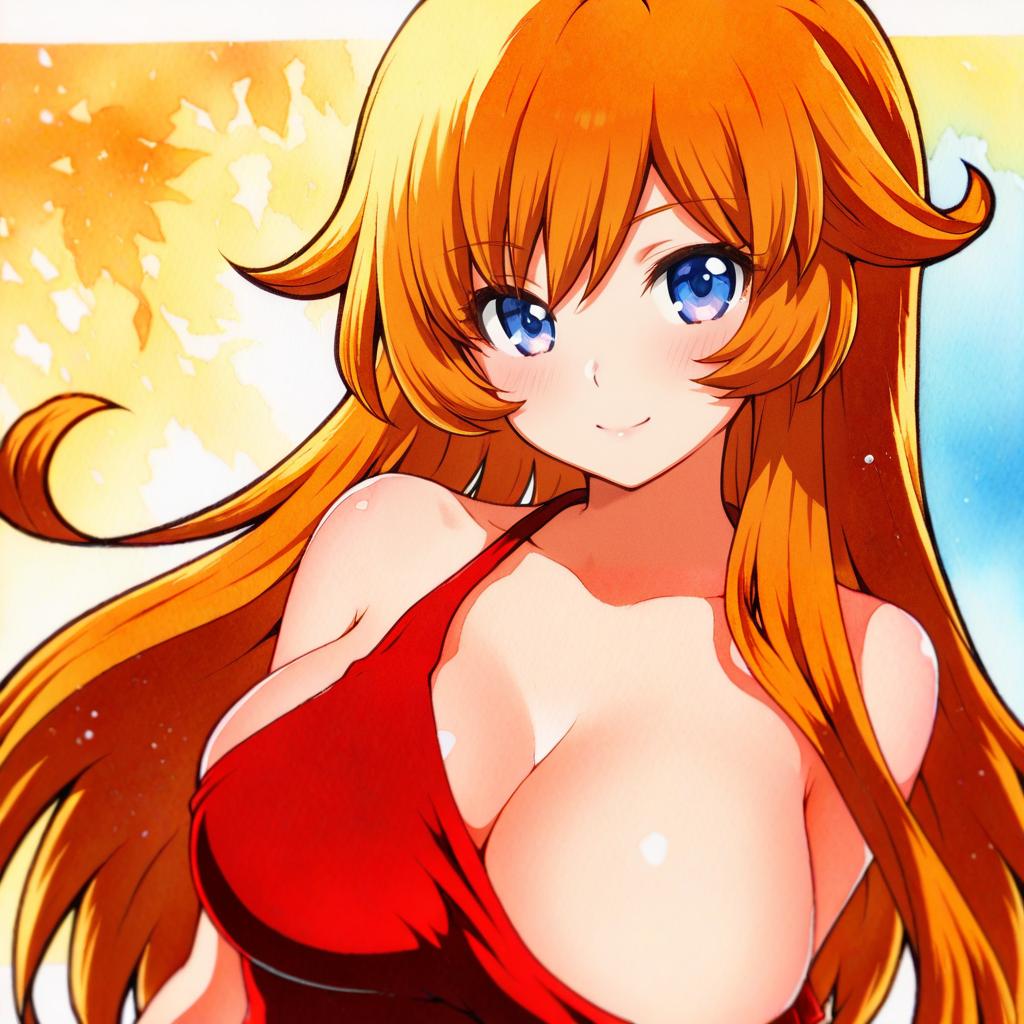 Digital anime-style drawing of a young woman with long, flowing orange hair and large blue eyes. She has a fair complexion and is wearing a low-cut, red halter top that reveals her ample cleavage. The background features a gradient of yellow and blue with a subtle leaf pattern. Her hair has a slight curl at the ends, and she has a gentle, confident smile. The artwork has vibrant colors and a soft, glowing effect. The character's pose is slightly angled, emphasizing her chest and facial features.