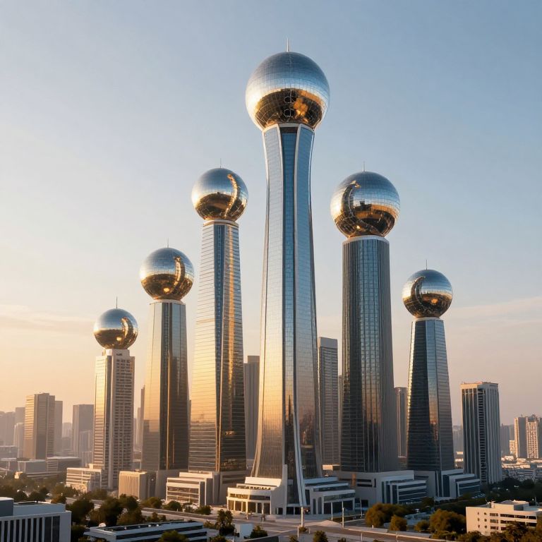 A futuristic cityscape rendered in high-definition 3D art showcases mirrored domes that ascend skyward, symbolizing the passage of time, with modern skyscrapers emerging from the ground and growing upward, creating a reverse chronological architectural marvel under golden-hour lighting.